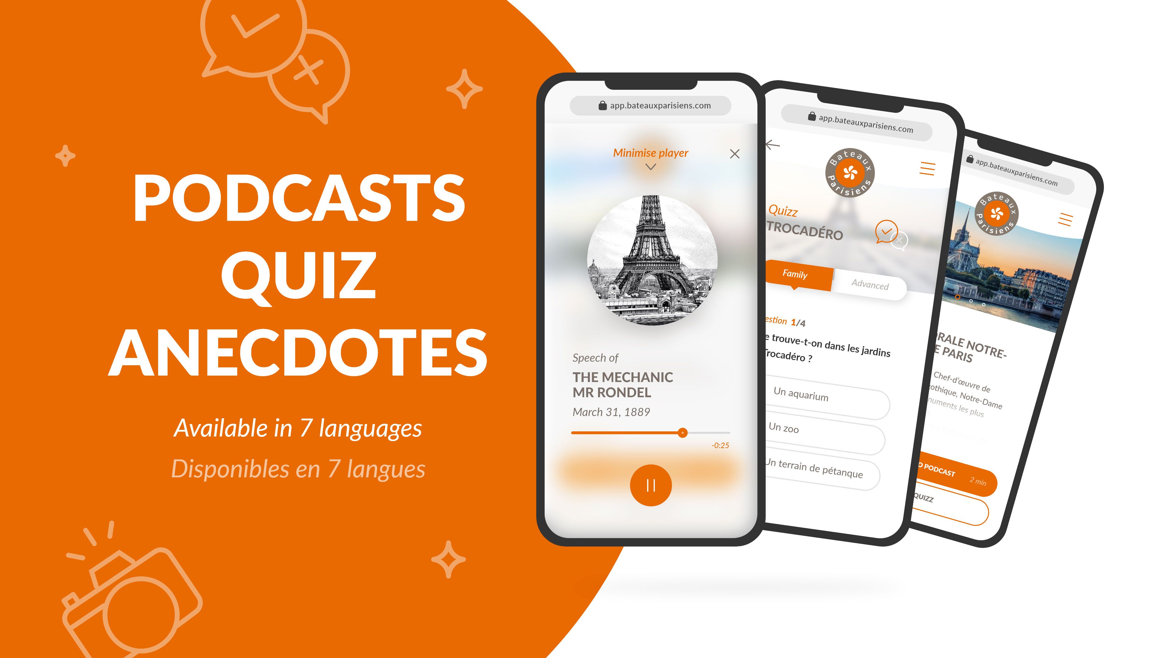 Nous concevons aussi les contenus disponibles en 11 langues. Au programme, podcasts immersifs, quiz et photolab permettant à tous les publics de découvrir Paris à leur manière.